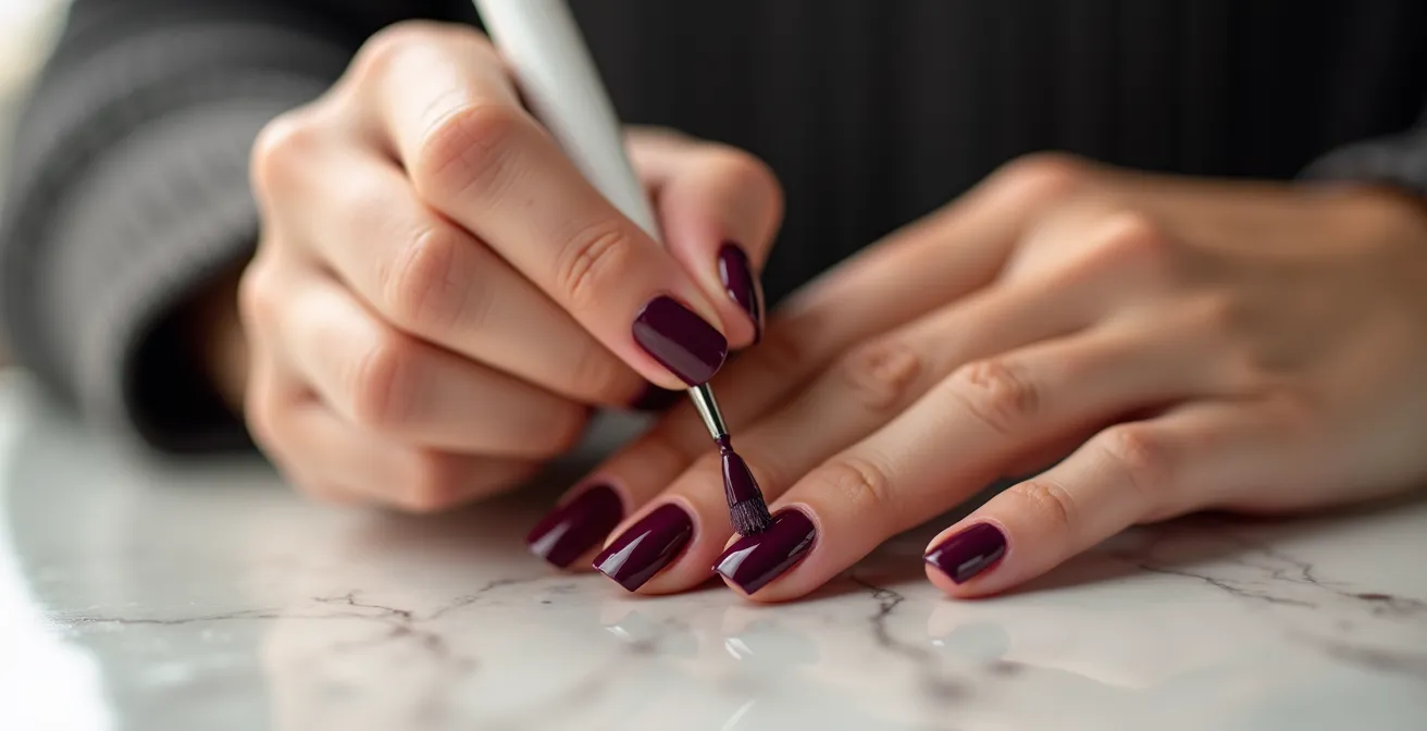 Das Geheimnis liegt darin, zwei hauchdünne Schichten anstelle einer dicken Schicht aufzutragen. Die erste Schicht muss nicht perfekt deckend sein; sie dient als farbige Grundierung. Lassen Sie sie gut antrocknen, bevor Sie die zweite Schicht auf die gleiche Weise auftragen. Ein entscheidender Profi-Tipp ist das Versiegeln der Nagelspitze, auch „Capping“ genannt. Ziehen Sie den Pinsel nach dem letzten Strich sanft über die vordere Kante des Nagels. Diese minimale Aktion schafft eine Barriere und ist der wirksamste Schutz gegen das Absplittern des Lacks im Alltag.